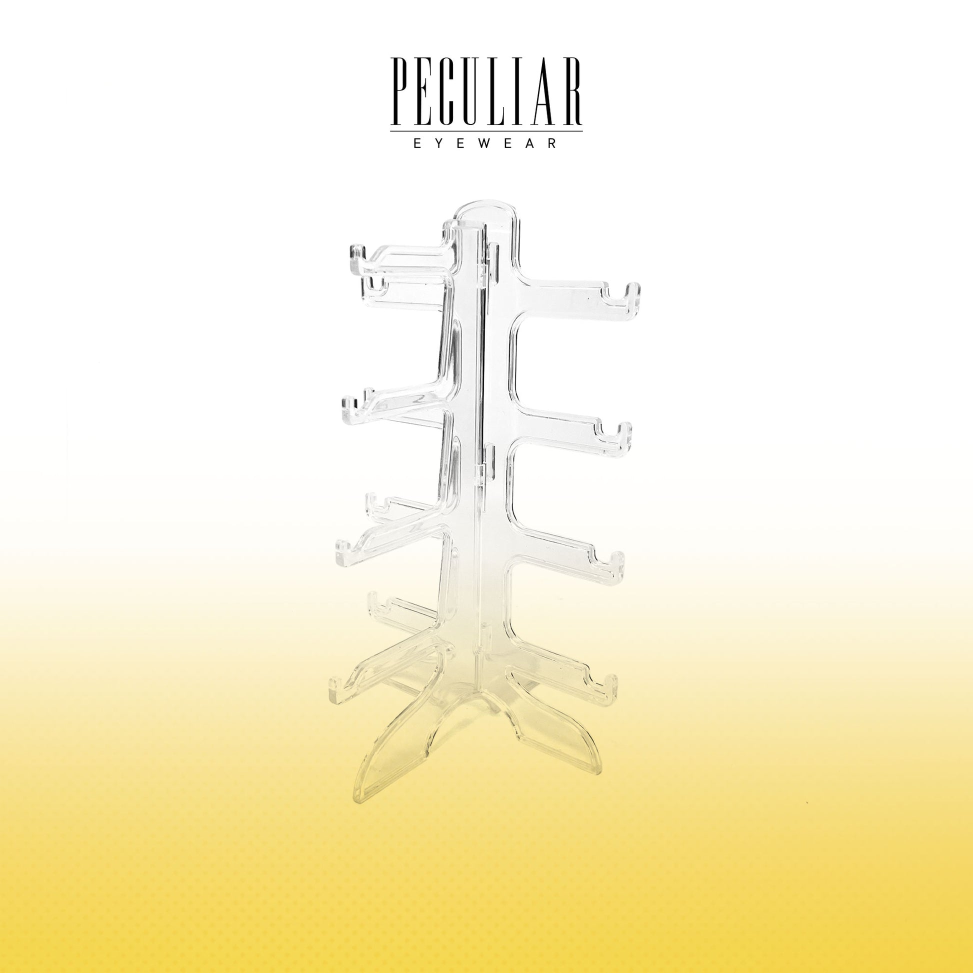 Organize and protect your eyewear collection with the Peculiar Eyewear Clear Acrylic Display Tree. Designed for modern convenience, this sleek organizer is available in three versatile sizes—3-Layer, 4-Layer, and 5-Layer—allowing you to choose the perfect capacity for your growing collection. The stand is incredibly easy to assemble, snapping together in seconds without the need for tools. Its vertical "tree" design maximizes valuable counter space on vanities or desks, while the durable, transparent acrylic construction provides a clean, minimalist look that lets your Peculiar frames take center stage. Each tier features notched arms to hold glasses securely, preventing scratches and ensuring your daily essentials are always visible and within reach.